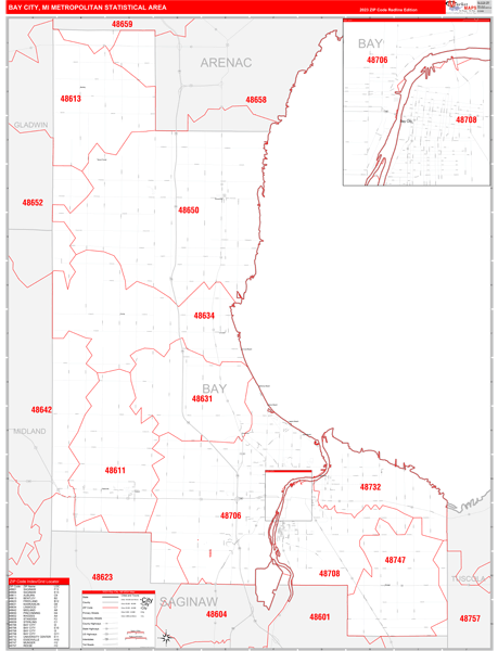 Bay City, MI Metro Area Wall Map Red Line Style by MarketMAPS